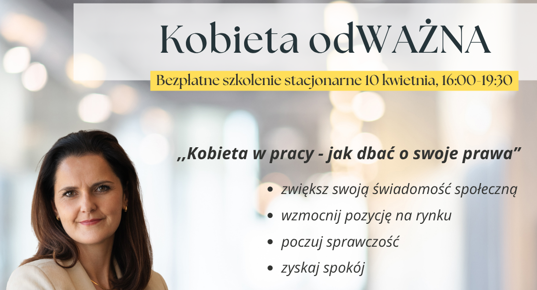 - 10 kwietnia, 16:00-19:30 bezpłatne szkolenie ,,Kobieta w pracy - jak dbać o swoje prawa"